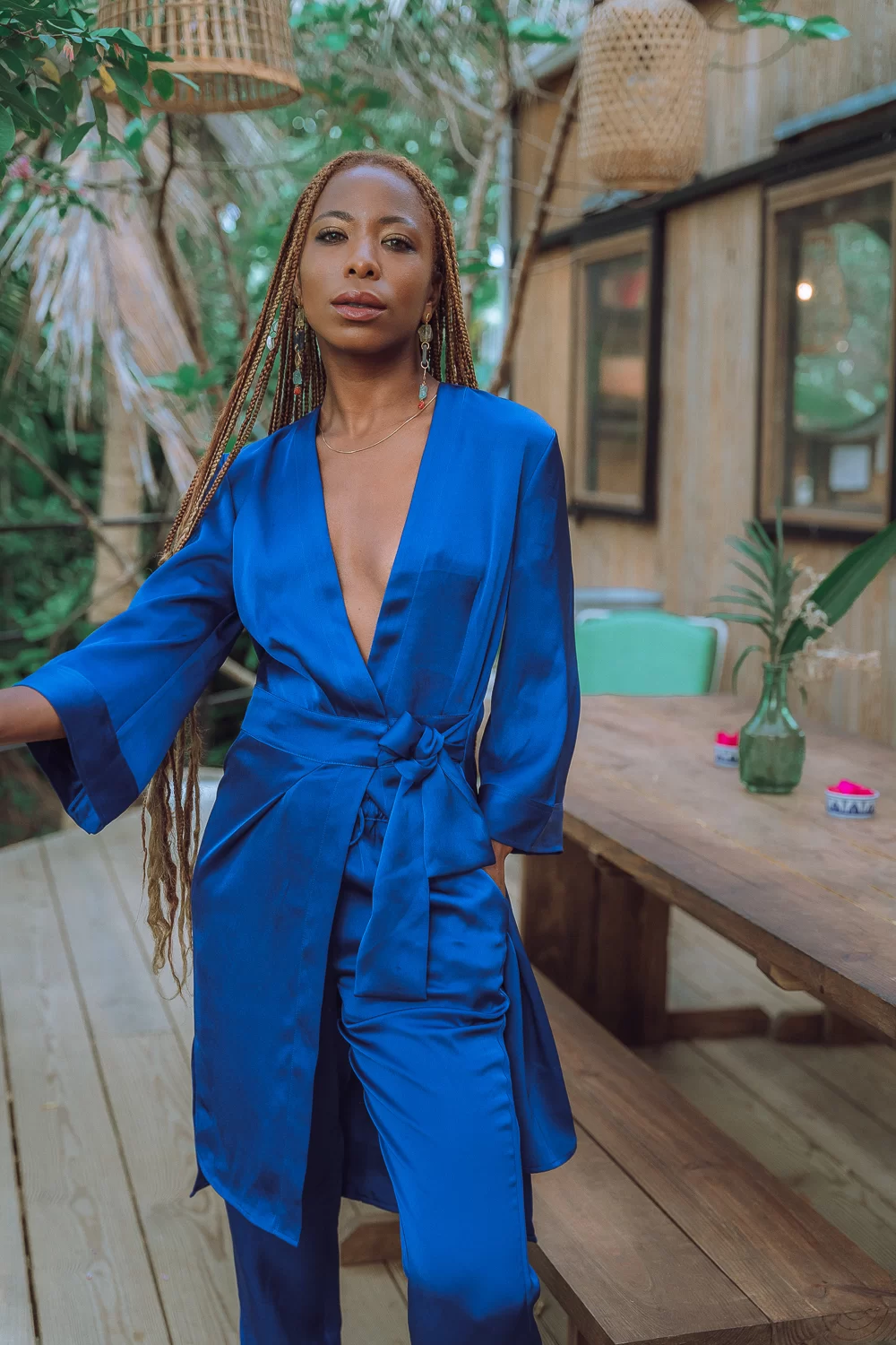 Their latest venture is in the world of “Luxe Lounge”, a trend that was the direct result of people spending more time at home but still wanting to feel special and glamorous. They took their favorite, timeless fabrics like royal blue satin that I am wearing here and reworked them with comfort in mind to make them feel like an escape.