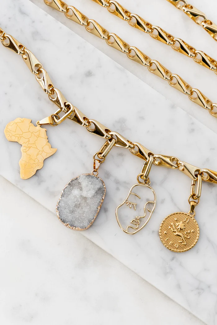 Elevate your chain belt and dress combination with thoughtfully layered jewelry: